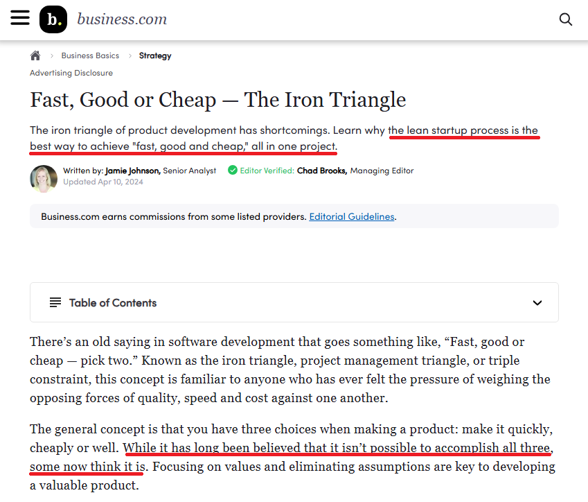 In the first paragraph, the author straight-up confirms that fast, good, and cheap CAN indeed co-exist in the same project by using the lean startup process, and we’ll revisit lean startups later… OK?